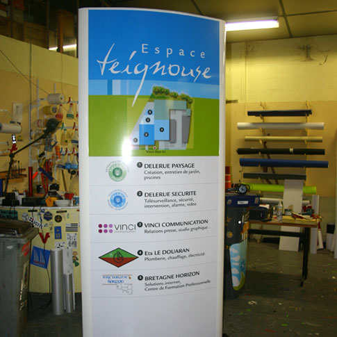 Totems intérieurs Totems extérieurs avec Marquage adhésif, Impression numérique, Lettres et logos posés sur entretoises...